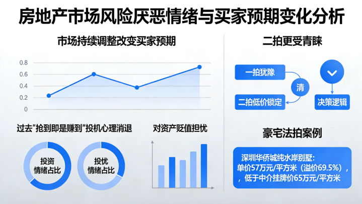 房地产市场的持续调整改变了买家预期。过去“抢到即是赚到”的投机心理消退,取而代之的是对资产贬值的担忧。购房者担心一拍买入后房价继续下跌,或后续出现更便宜的房源,因此更愿意在二拍以更低价格锁定安全垫。即便是豪宅法拍,