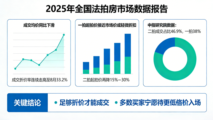 2025年全国法拍房成交均价同比下滑,成交折价率连续走高,至8月已达到33.2%。“足够折价才能成交”已成为市场铁律。购房者普遍认为,一拍起拍价往往接近市场价或仅有轻微折扣,缺乏安全边际;而二拍在起拍价上再降15%~30%,性价比显著提升。正如中指研究院数据显示,2025年二拍阶段成交占比高达46.9%,远超一拍的38.9%,说明多数买家宁愿等待更低的价格入场。