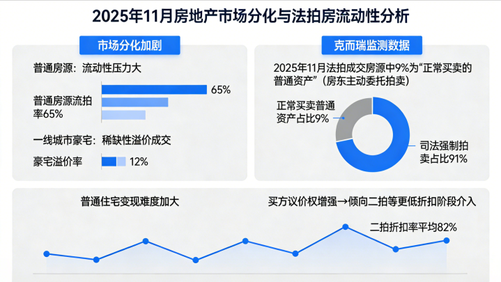 虽然一线城市豪宅因稀缺性仍有溢价成交案例,但绝大多数普通法拍房面临流拍困境。据克而瑞监测,2025年11月已有超过9%的法拍成交房源属于“正常买卖的普通资产”,即房东主动委托拍卖。这侧面印证了普通住宅变现难度加大,买方因此拥有更强的议价权,自然倾向于在二拍等更低折扣阶段介入。
