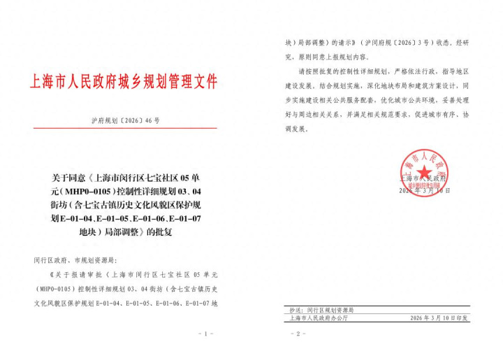 上海进深 李誉 近日,据上海市规划和自然资源局官网显示,闵行区七宝社区05单元(MHP0-0105)控制性详细规划03、04街坊(含七宝古镇历史文化风貌区保护规划E-01-04、E-01-05、E-01-06、E-01-07地块)局部调整,正式获得批复。