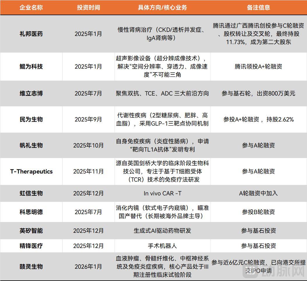 腾讯2025-2026年1月年投资的医疗企业